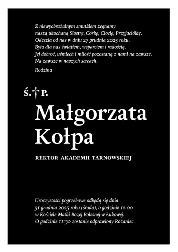 Msza święta w intencji śp. Magnificencji Rektor odbędzie się w piątek, 9 stycznia 2026 r. o godz. 14 w Bazylice Katedralnej w Tarnowie.